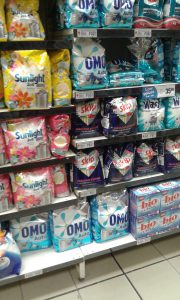 Then we have straight forward catch-the-eye diversion where the “Low prices for you” flag is at eye level offering 2kg of OMO Auto washing powder for P35.95. Meanwhile down at foot level (so low my phone couldn’t even get it in focus) are the 3kg packets for about P45 each.